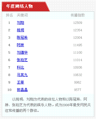 受到北京舉辦奧運(yùn)會(huì)的影響和“艷照門”事件的炒作,以姚明、劉翔為代表的體壇人物和以陳冠希、阿嬌、張柏芝為代表的娛樂人物,成為最受關(guān)注和傳播的兩類公眾人物??票取⒇惪藵h姆和菲爾普斯為十份榜單中僅有的三名外籍人士,科比還同時(shí)入選年度網(wǎng)絡(luò)人物和年度體壇人物的十強(qiáng)。在年度企業(yè)家榜單中,以王石、黃光裕、牛根生等為代表的爭(zhēng)議性人物和以丁磊、馬云為代表的商業(yè)模式英雄,成為最受關(guān)注和傳播的兩類企業(yè)家。