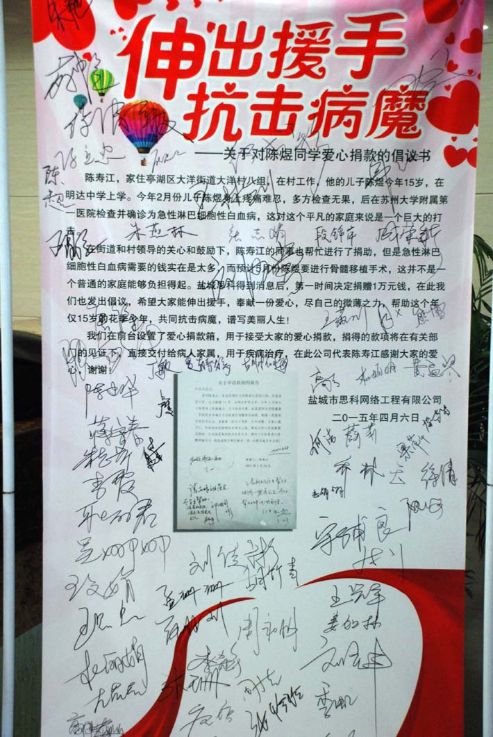 4月7日,在公司領(lǐng)導(dǎo)的關(guān)心和倡議下,鹽城思科全體員工發(fā)起了為陳煜同學(xué)愛心捐款的活動,大家都主動從自己的工資里拿出一百、五十、二十、十元……盡自己的微薄之力為陳煜同學(xué)獻(xiàn)上一份愛心,助其抗擊病魔,走出困境。